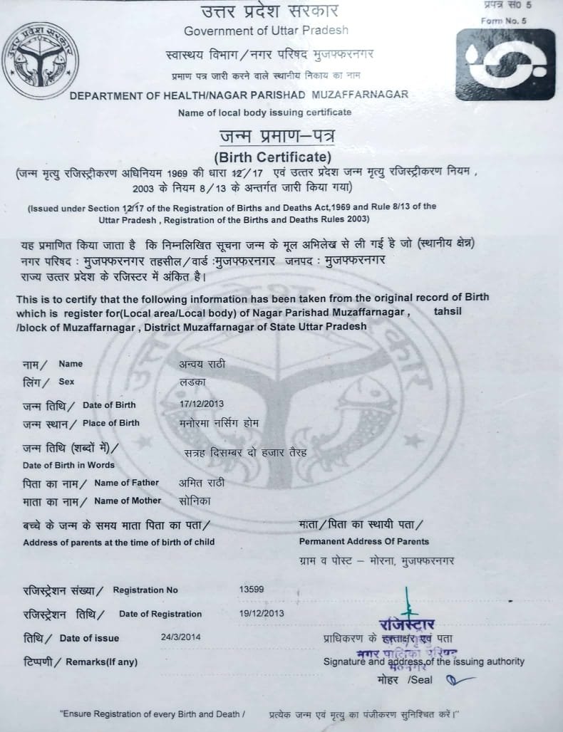 | Address | ANVAY RATHI S/O AMIT RATHI, RATHI BHAWAN, MORNA ,MUZAFFARNAGAR | Location | District: MUZAFFARNAGAR State: Uttar Pradesh |