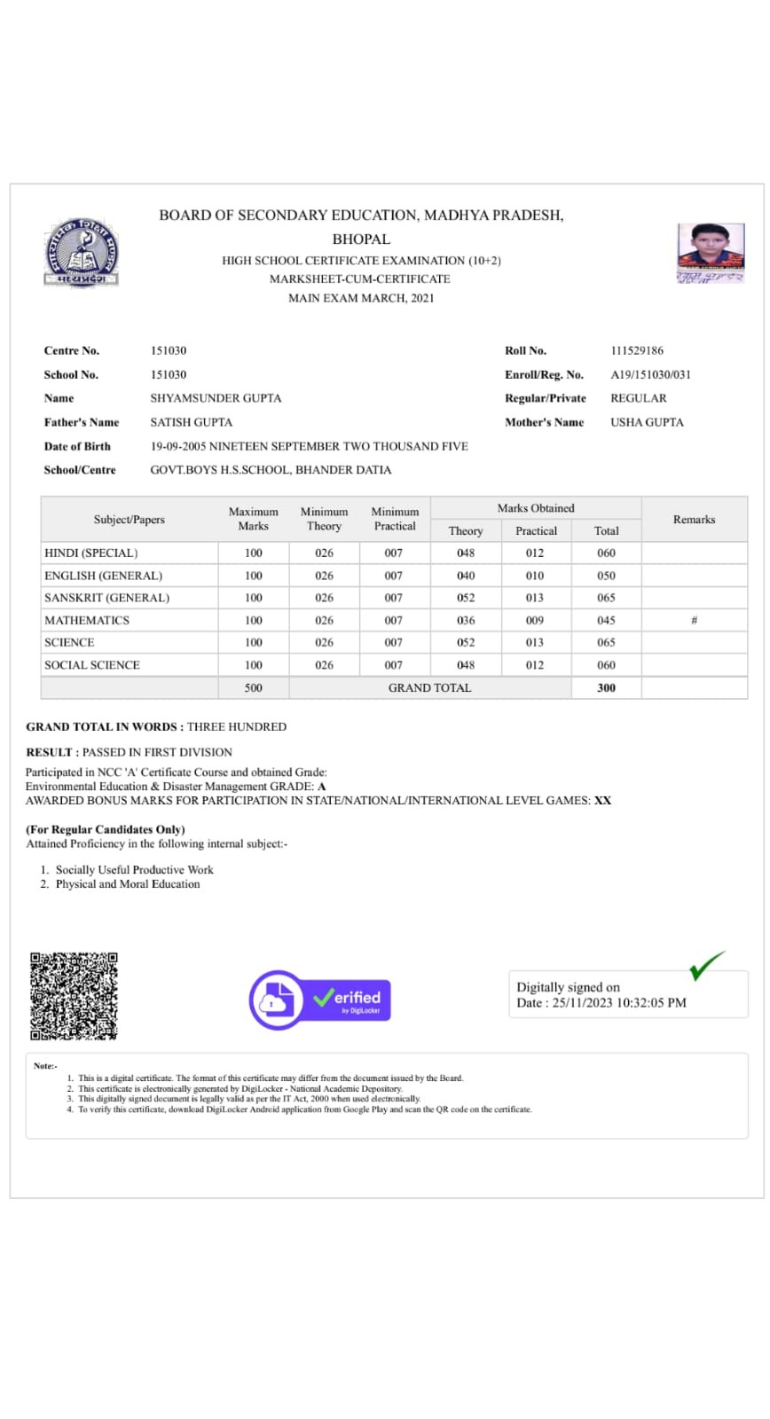 | Father's Name | Satish Gupta | Gender | Male | Date of Birth | 19-09-2005 |