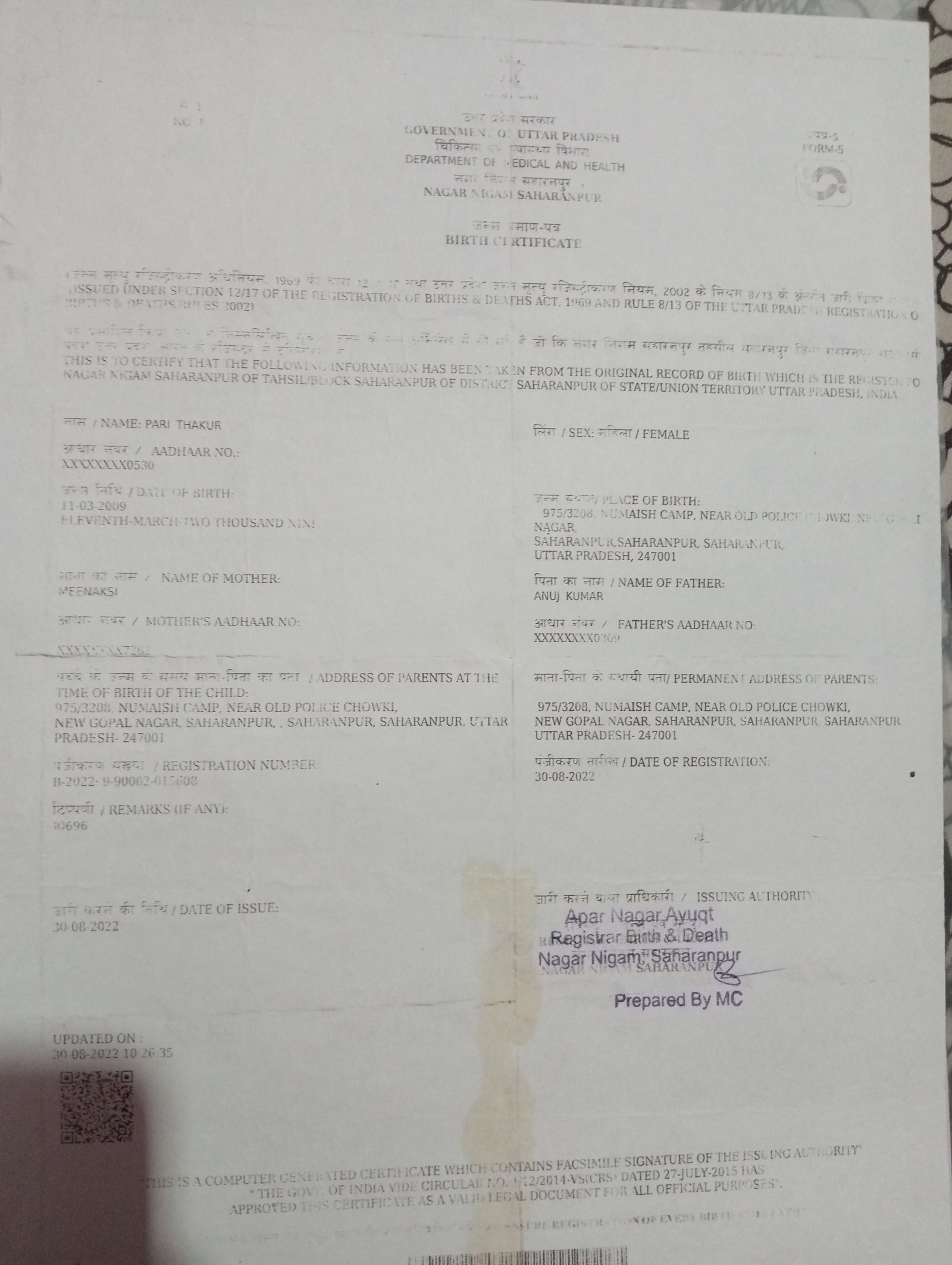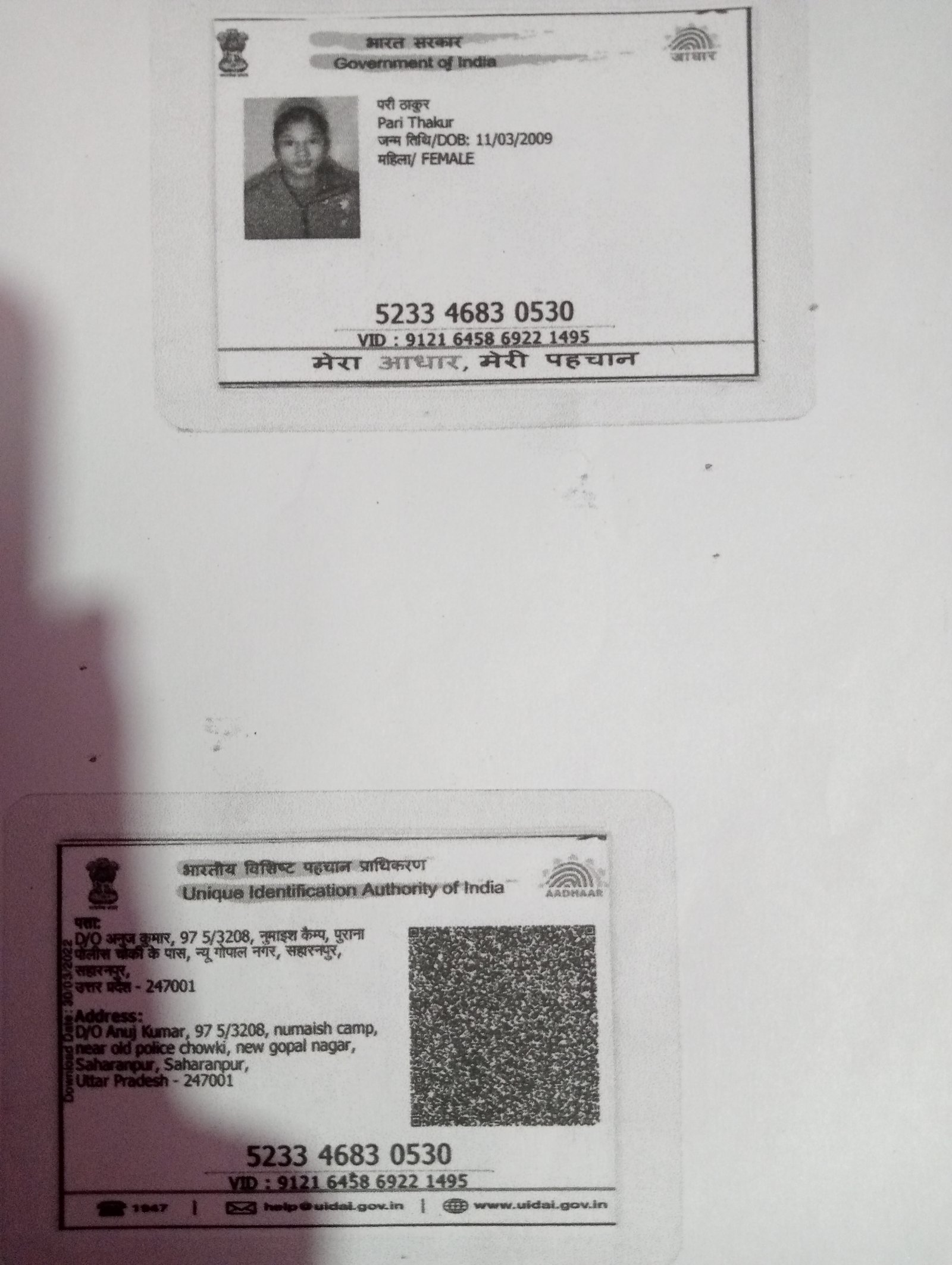 | Father's Name | Anuj Kumar | Gender | Female | Date of Birth | 11-03-2009 |