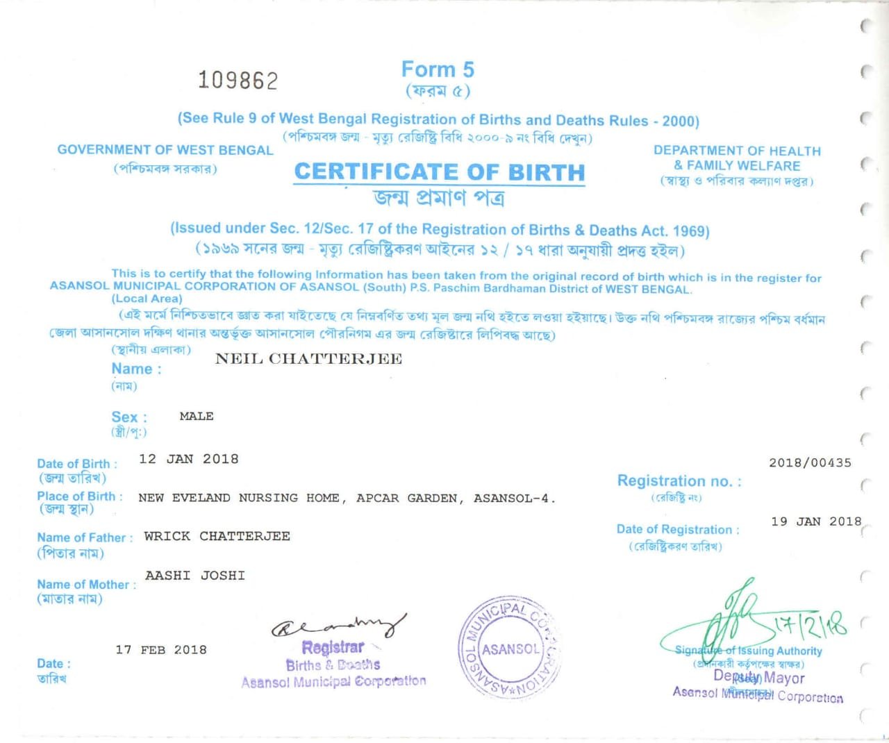 | Father's Name | Wrick Chatterjee | Gender | Male | Year of Birth | 2018 |