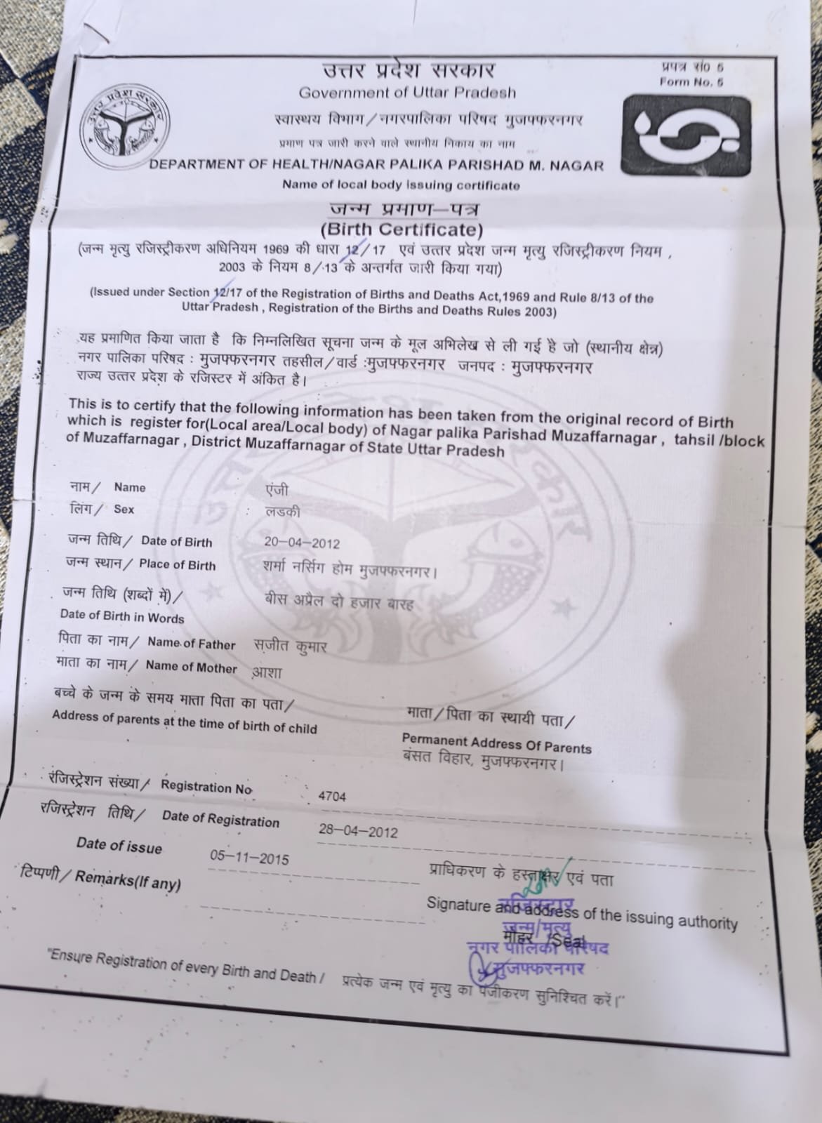 | Father's Name | SANJEET KUMAr | Gender | Female | Year of Birth | 2012 |